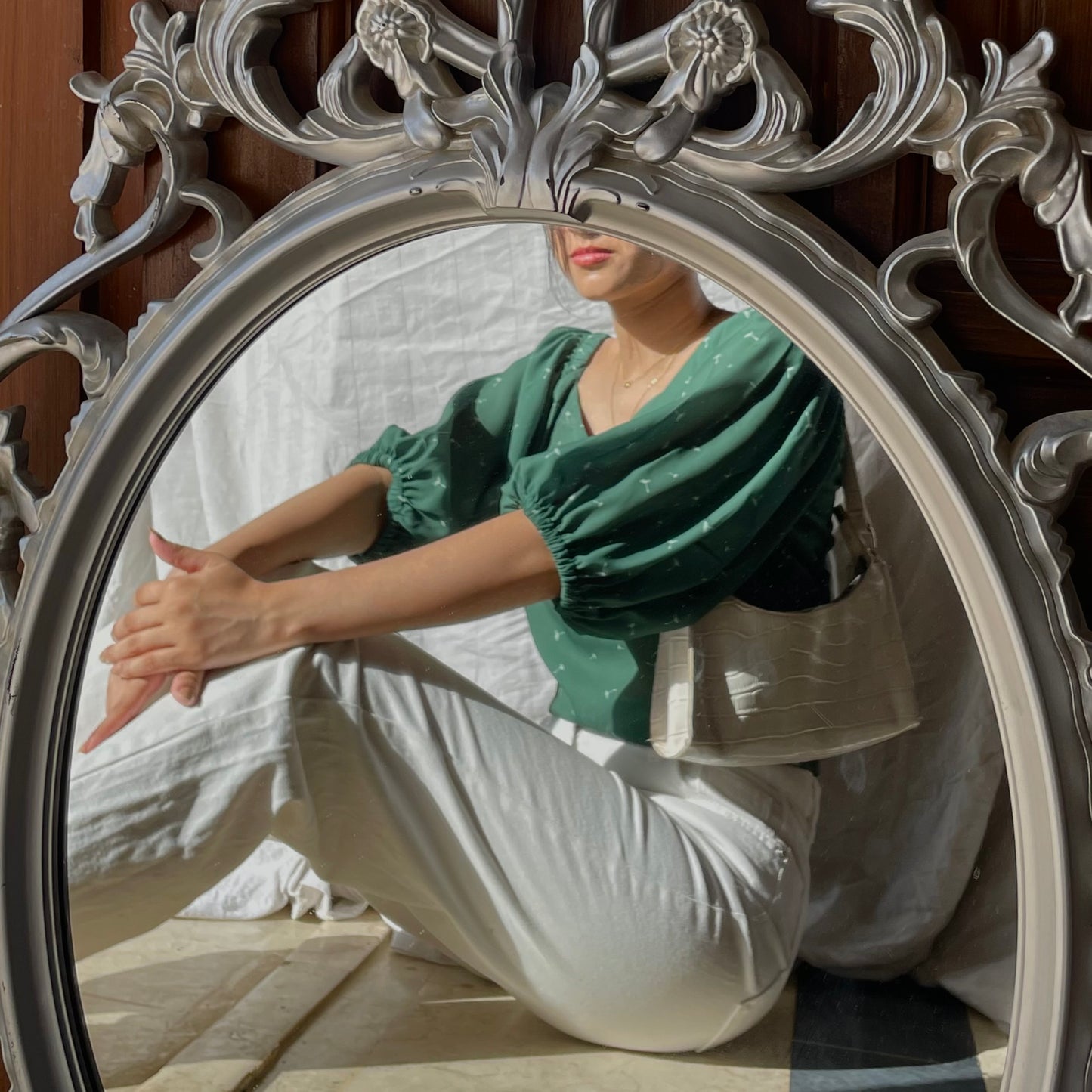 Perfect harmony of elegance, where nature meets fashion. Shop our pine green, dandelion printed top with diamond cut neckline and puffy sleeves.