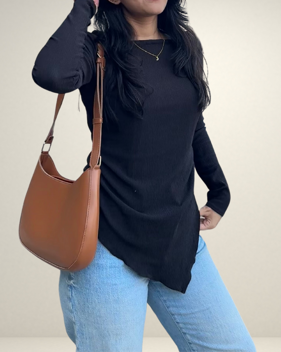 Elevate your wardrobe with this sophisticated black asymmetrical top, crafted from textured georgette for a graceful drape. The design features cap sleeves that delicately frame the shoulders, offering a touch of femininity without compromising on comfort. Clean lines and subtle structure make it a versatile piece for day or night.